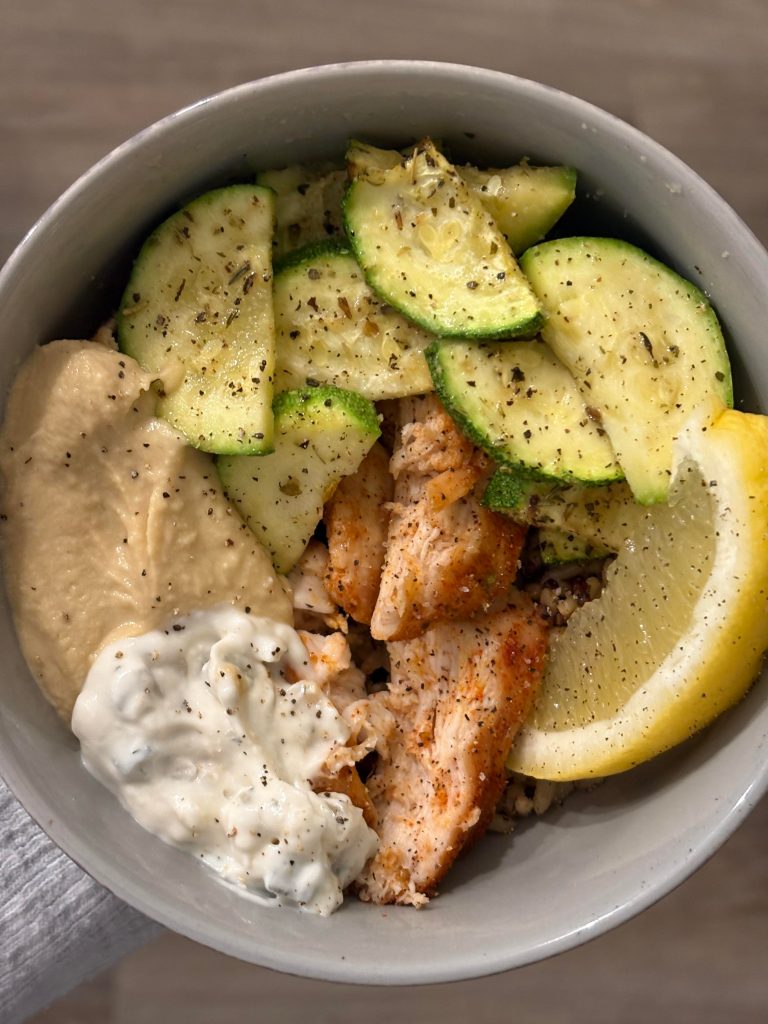 - Assemble your bowl. To assemble your Mediterranean chicken bowl, divide the zucchini, quinoa, and chicken among 2 bowls. Finish by topping your bowl with a scoop of hummus, a lemon wedge, Tzatziki sauce (or dip), and parsley.